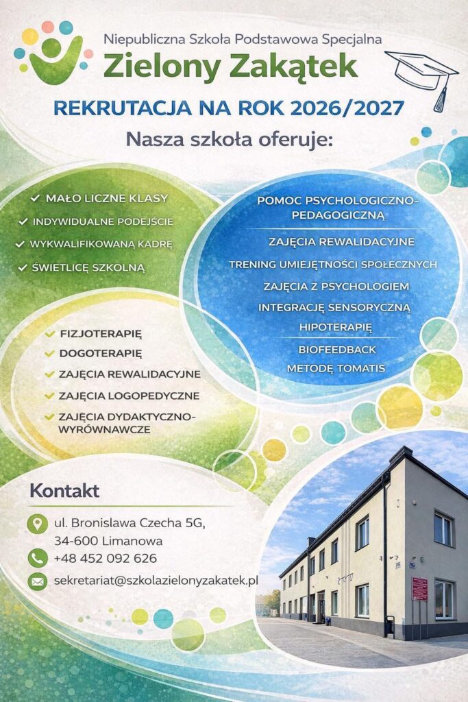 Rekrutacja uczniów do Niepublicznej Szkoły Podstawowej Specjalnej „Zielony Zakątek” odbywa się cały rok.